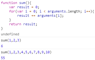 위와 같이, 자바스크립트에서 함수에 전달되는 인자가 정해진 개수를 초과하여 들어가는 경우, arguments라는 배열에 들어가게 된다. 그래서 위와 같은 함수를 정의할 수 있다.