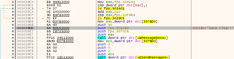 문자열 참조로 Game Clear!를 찾으면 위와 같은 루틴을 찾을 수 있는데, eax가 0x309194부터 0x210씩 커지며, 0x30F8B4와 크거나 같아지면 clear가 된다. 이 때 eax의 주소에 있는 값이 전부 1이 아니어야 한다. (flag같으므로, 0이어야 함을 예상할 수 있다.)